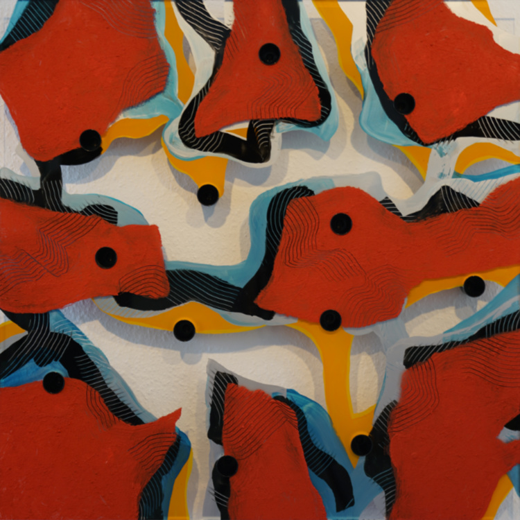 "Schwarze Löcher: Inseln", Acryl auf und hinter Acrylglas von 1 cm Stärke, Kunststoffdosen, 80 x 80 x 5,5 cm, 2022 Fenster schließen